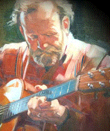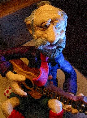 Above photo is at a Festival Workshop, one of the few times I play sitting down, and look Ma, No Capo! below, my wife Kathleen's Sculpture, "Simone" |